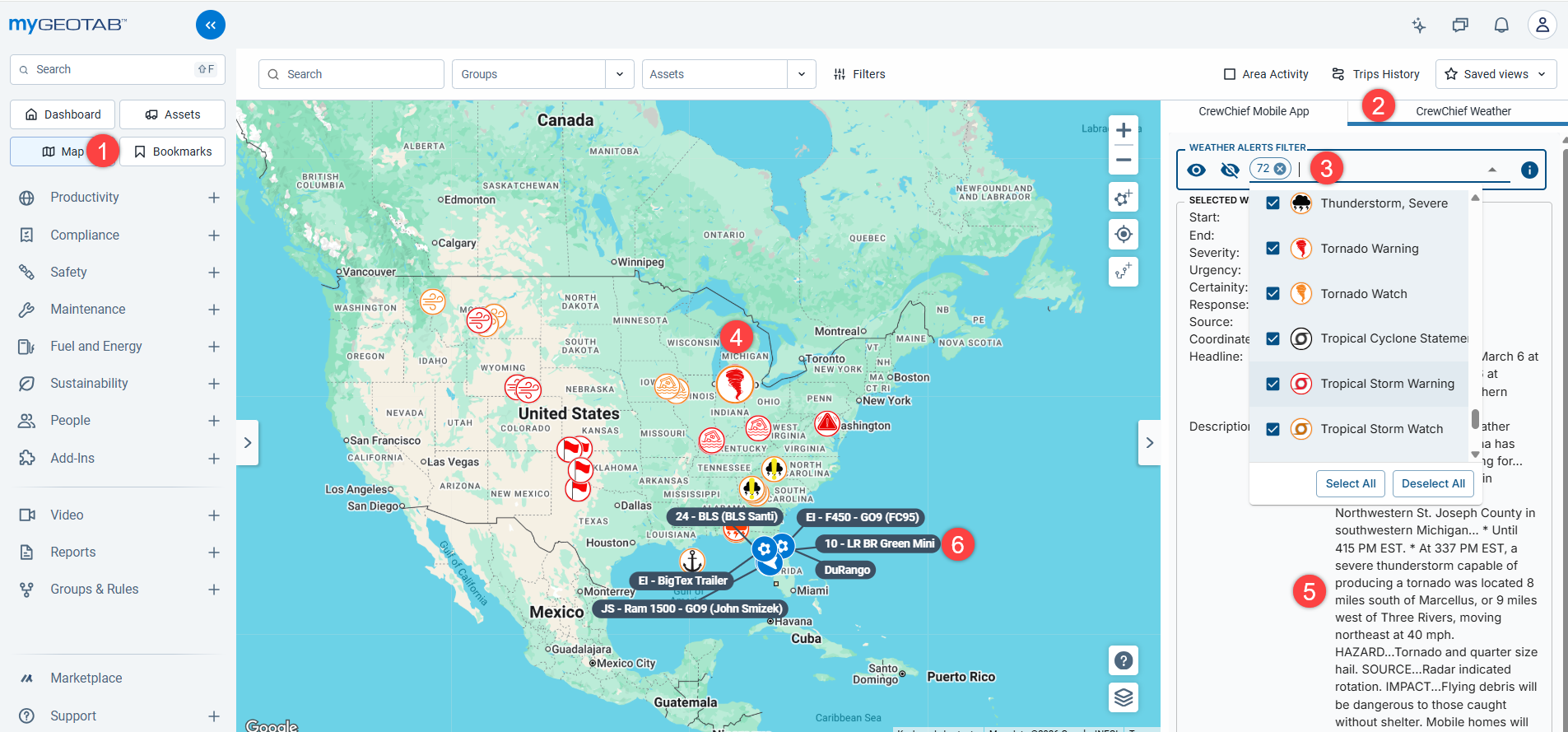 Note: On the right of the native Geotab map, alert options are available from various services such as the National Weather Service. Weather layers such as radar and driving conditions are not visible on Geotab’s map. Geotab does not allow overlays, just icons, on their map. The CrewChief Critical Weather map provides full features and functionality.