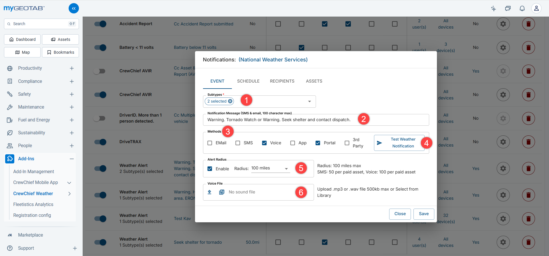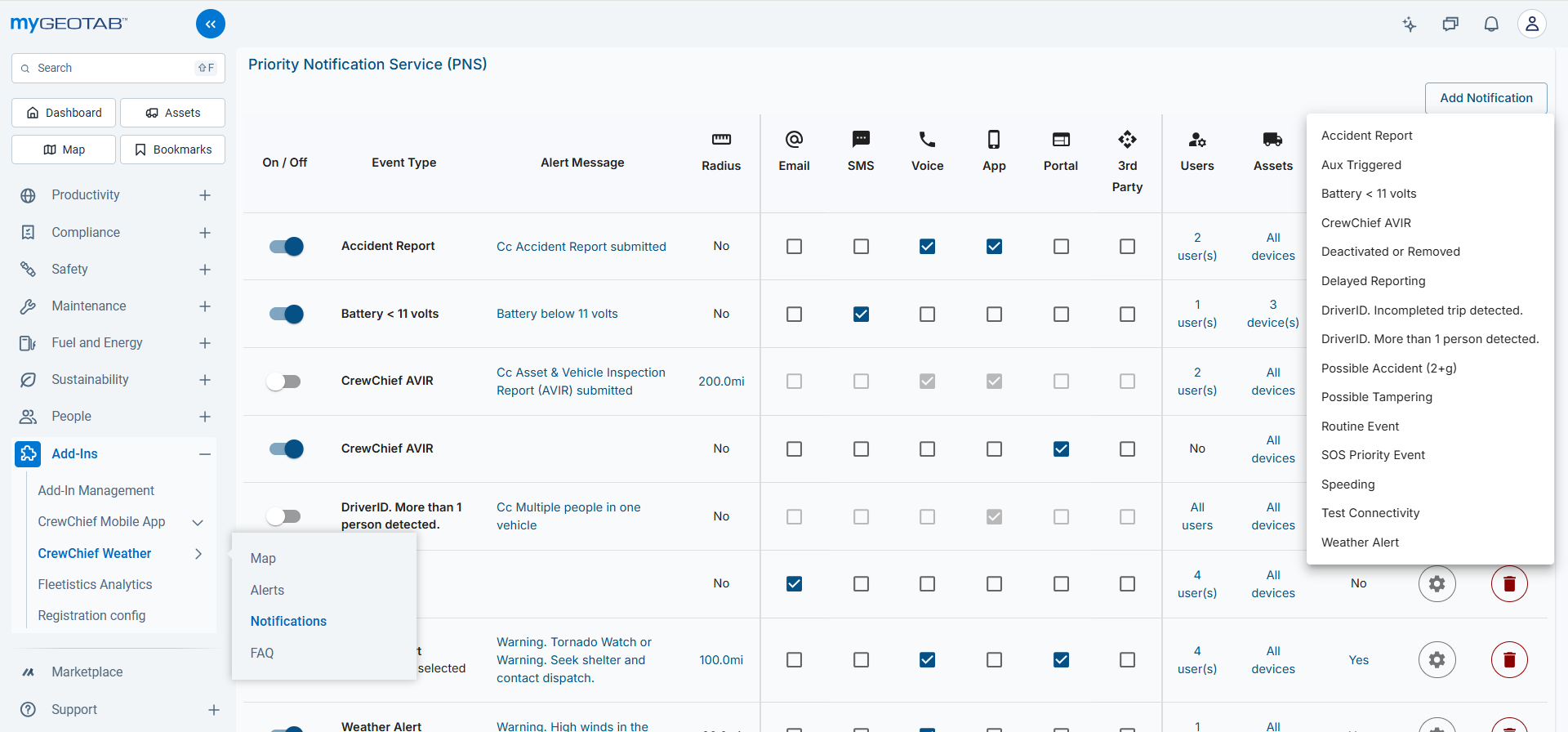 Note: Notifications are automatically enabled for the CrewChief mobile app which can also be installed through the marketplace. Notifications to the mobile app are only available when you have both the Critical Weather Service and the CrewChief Mobile App service. They are two separate services.